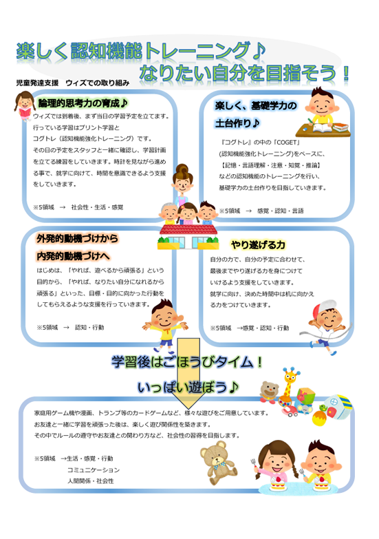 放課後等デイサービス・児童発達支援 ウィズでは、5領域「健康・生活」「運動・感覚」「認知・行動」「言語・コミュニケーション」「人間関係・社会性」をふまえた総合的な支援を行うとともに、支援の見える化を目的として、5領域との関係性を明確に示した支援プログラムを公表しております。